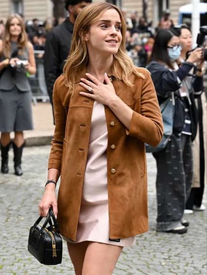 The warm chestnut brown tone exudes natural sophistication, making it a versatile choice for spring and summer transitions. The subtle sheen of the vegan leather complements the minimalist design — a hallmark of Emma Watson’s effortlessly chic style. The coat’s longline cut enhances its modern edge, perfect for layering over lightweight knits, dresses, or tailored trousers.